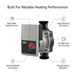 The durable pump housing is manufactured from cast iron with cataphoresis corrosion protection for long term reliability. Internally, the pump uses a stainless steel shaft and reinforced composite impeller designed to withstand continuous operation in heating systems and water glycol mixtures.